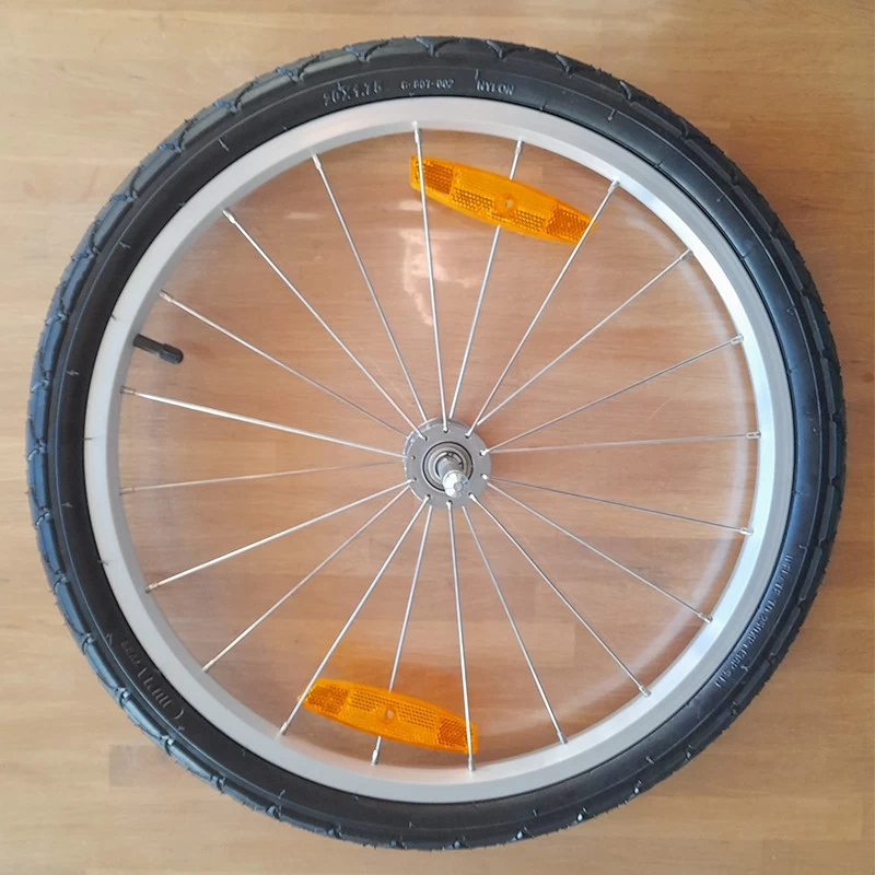 Cette roue de 20 pouces avec pneu, jante et chambre à air est parfaite pour remplacer une roue abîmée ou voilée sur une remorque vélo enfant, celle-ci est munie d’un axe en acier zingué à démontage rapide d’un diamètre de 12,62 mm et pour la sécurité du cycliste, la roue est muni de 2 catadioptres orange.