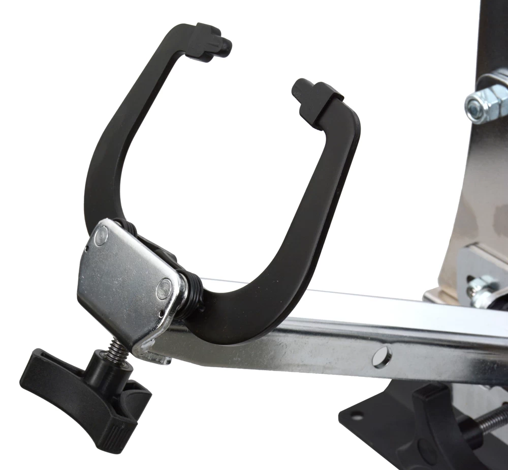 Il est également possible de fixer le support à l’établi à l’aide de vis. Le serrage du moyeu, le réglage des bras de centrage et de la potence s’effectuent à l’aide de boutons manuels ergonomiques.